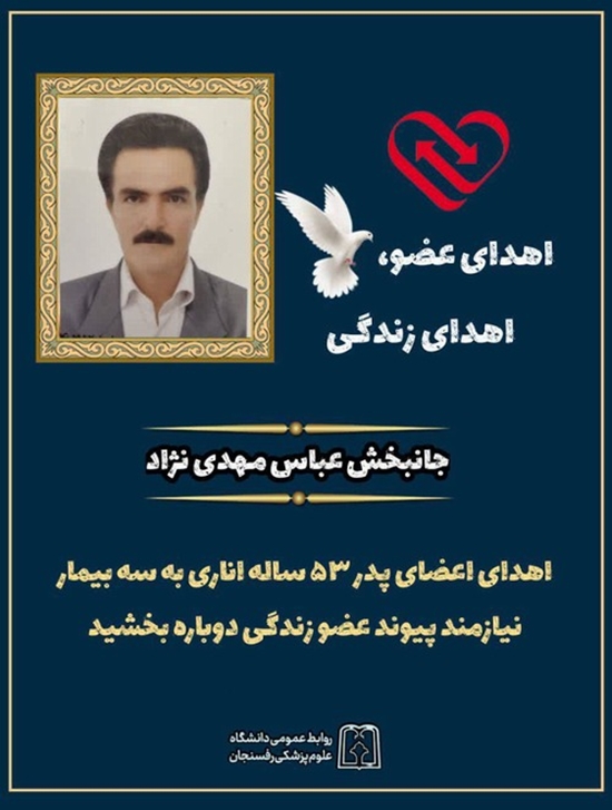 به گزارش روابط عمومی دانشگاه علوم پزشکی رفسنجان، کارشناس هماهنگ کننده واحد فراهم‌آوری پیوند عضو دانشگاه علوم پزشکی رفسنجان گفت: زنده‌یاد «عباس مهدی نژاد»، پدر ۵۳ ساله اهل شهرستان انار در تاریخ ۲۸ تیر ماه بر اثر سقوط از ارتفاع دچار مرگ مغزی شد. متأسفانه تلاش‌های پزشکان و کادر درمانی برای نجات او مؤثر واقع نشد و مرگ مغزی او تأیید شد.