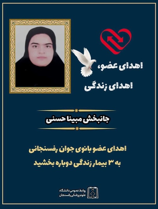 وی افزود: خانواده ایثارگر و نیک‌اندیش مبینا حسنی با اهدای اعضای پاره‌تن خود، از جمله کبد و کلیه‌ها، به سه بیمار نیازمند عضو، زندگی دوباره‌ای بخشیدند. این خانواده با این اقدام انسان‌دوستانه، دومین عمل اهدای عضو را در سال ۱۴۰۴ در رفسنجان به نام خود ثبت کردند.